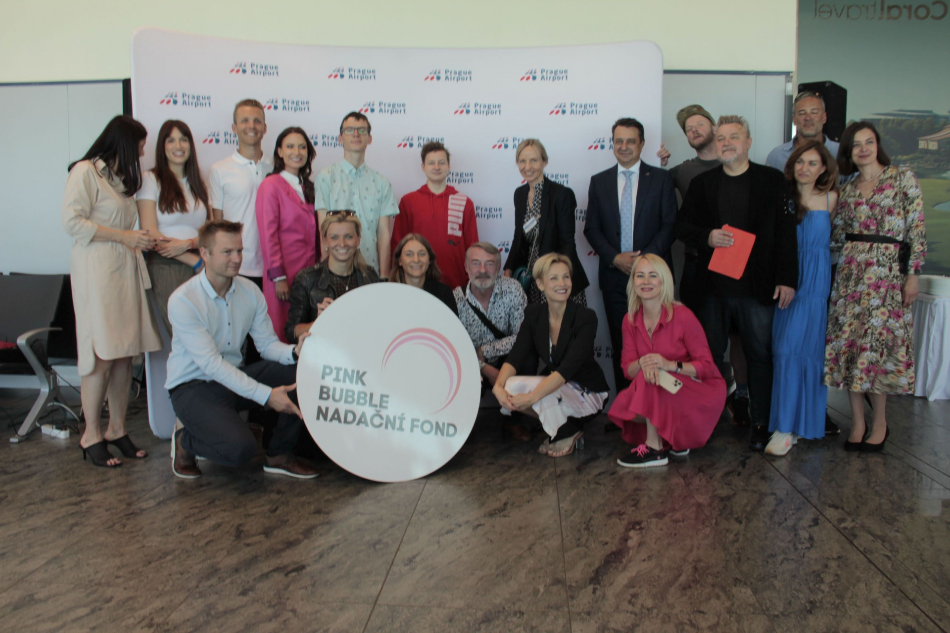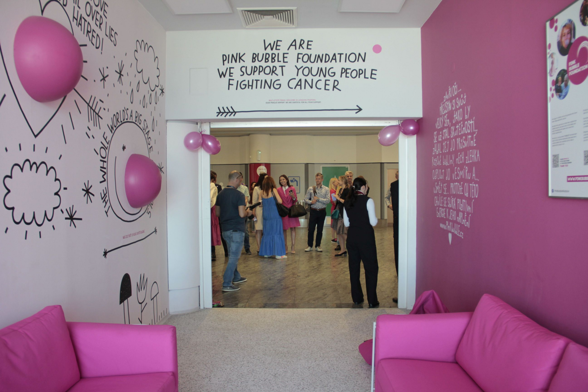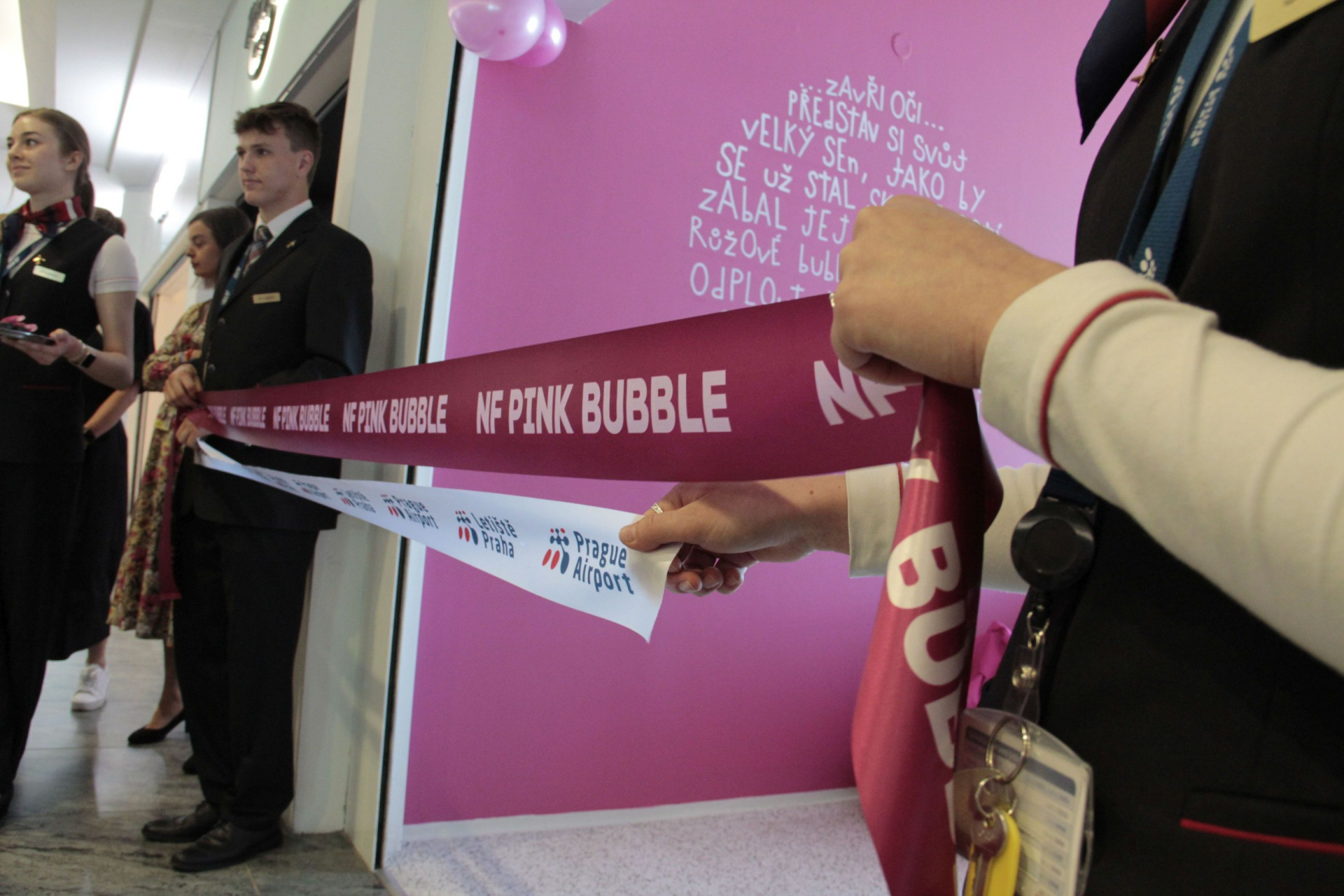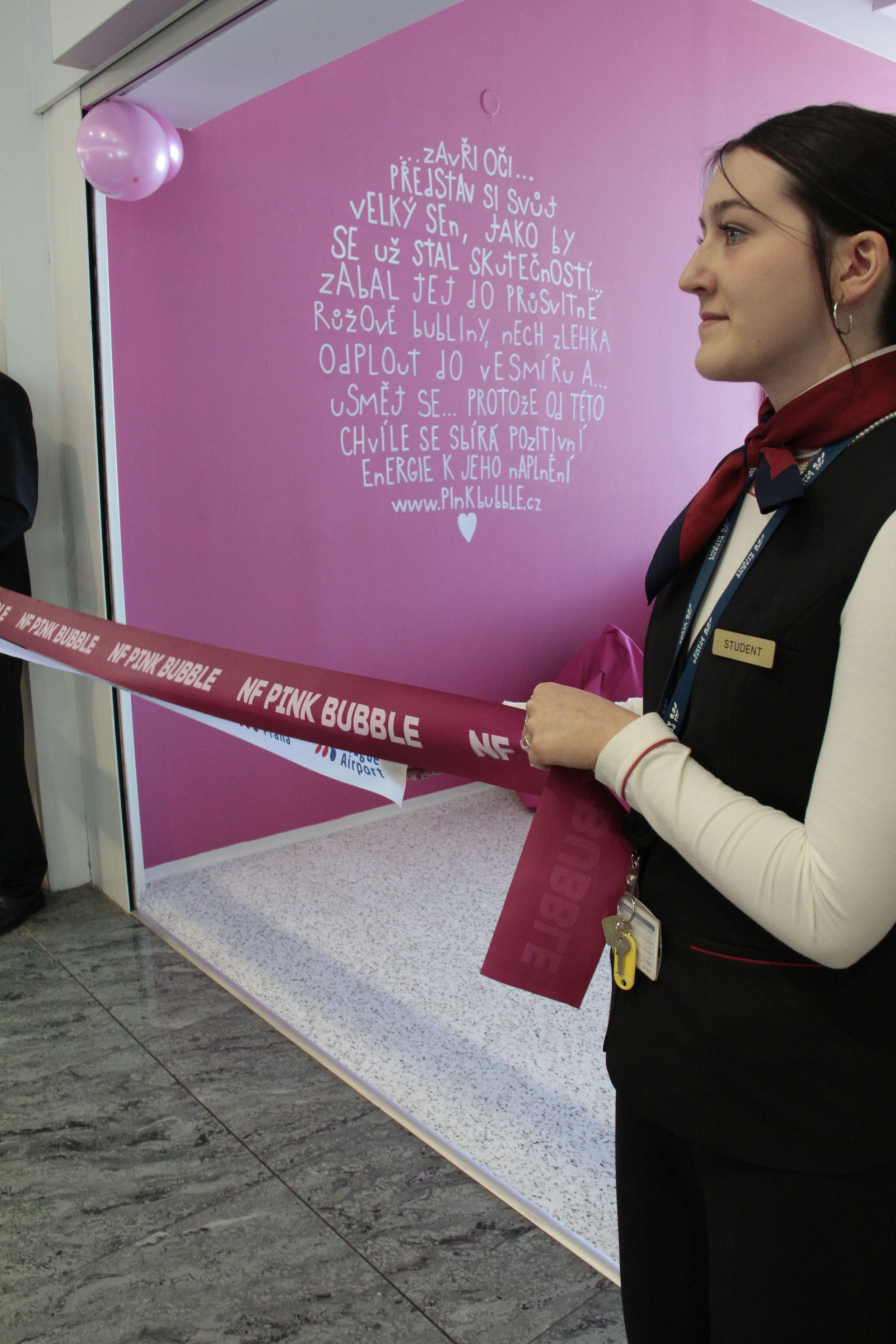 Výtvarník Lukáš Urbánek společně s Davidem Foldynou a Pavlem Melicharem  ze studia AD13 vyzdobili prostor pro relaxaci a chvilky k meditaci a zamyšlení před odletem do dalekých krajů. Při slavnostním otevření nám pomohli přestřihnout pásku naši milí patroni Jirka Dvořák, Elizabeth Kopecká, Miloš Pokorný a Jana Melichová, připojili se také Gábina Partyšová, piloti Lukáš Pařízek a pan Ivan Bednařík. V terminálu 1 najdete náš růžový pokojíček v nejzazším koridoru, těsně než nastoupíte do letadla. Užijte si moudré citáty našeho prvního polistopadového prezidenta Václava Havla (děkujeme paní Dagmar Havlové za povolení k jejich užití) a také meditaci růžové bubliny, která byla inspirací pro název naší nadace. Přejeme vám šťastnou cestu a krásné výlety za sny a za poznáváním.